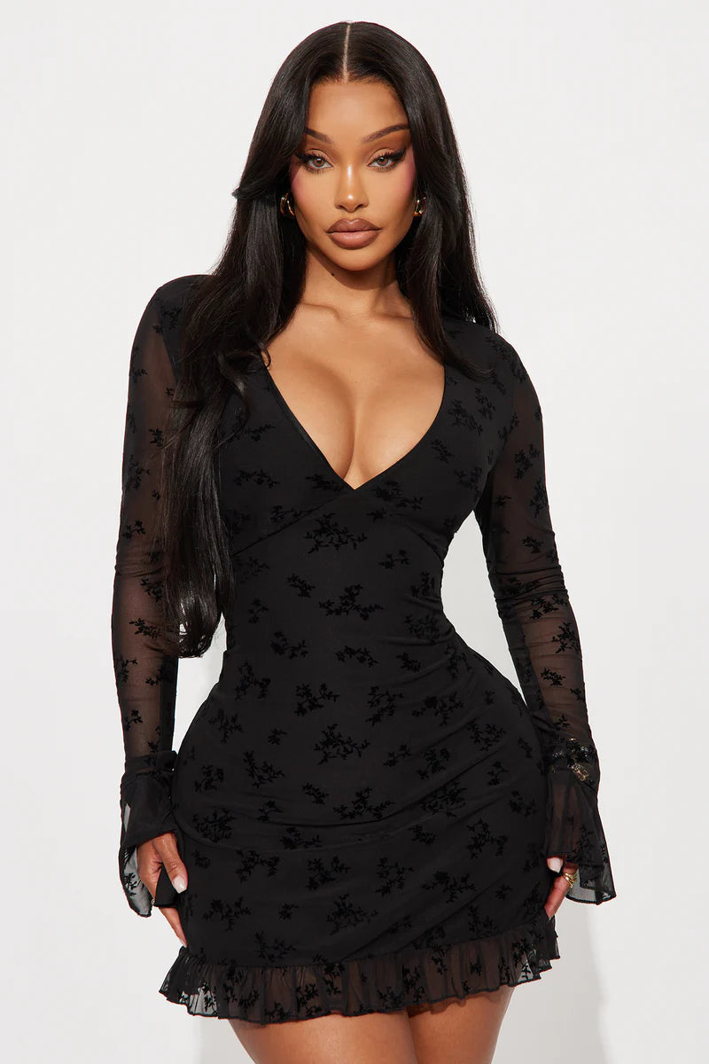 Juliet Flocked Long Sleeve Mini Dress - Black